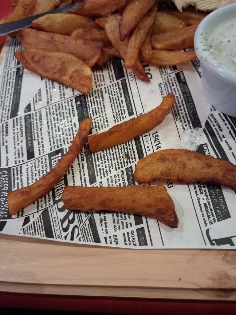 There was only one other couple eating when we got there, and they soon left, so it was only the two of us in the whole place. I ordered fish and chips – I love to have this about 3 times a year, and was really looking forward to a big piece of freshly battered fish that’s always on offer somewhere local on Fridays. Peter ordered a chicken kebab. Both dishes came with chips.