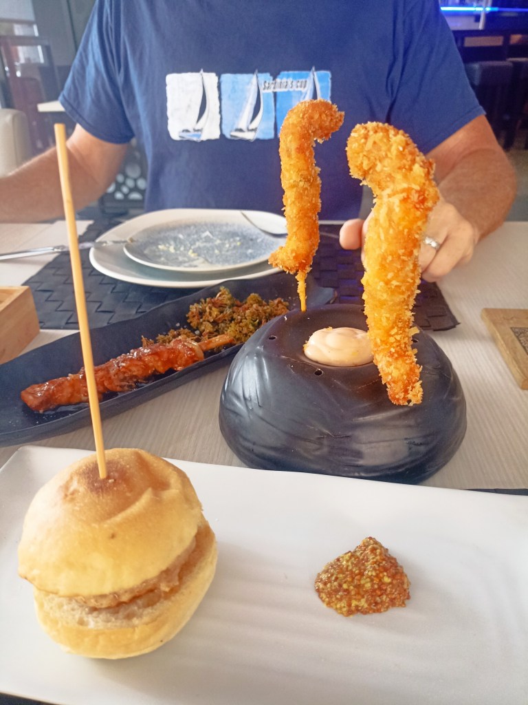 We went to Alcantarilla recently, a town about 10 minutes the other side of Murcia city. We were looking for a particular shop – mission accomplished and bank account considerably lighter! We had a look online for somewhere to have a bite of lunch, and the husband found a restaurant called La Cava de Royan. It opens up from a small street onto a little square, and you’d never guess the quality of food just by looking at the outside! We had a mouthwatering selection of tapas, including little bites of succulent cod, enormous prawns in panko crumbs, skewers of the most tender pulled pork with crispy broccoli, mini pork burgers, and all accompanied by a fabulous variety of sauces like chilli mayonnaise, and honey mustard. The presentation and service were fantastic too!