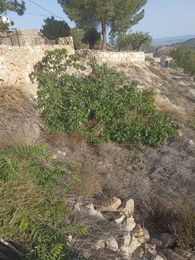 We’re planning the next stage of the garden, getting another area cleared properly. It’s the vaguely terraced bit beyond the walled garden, and there’s quite a lot of it! There are a number of almond trees, and there’s even a little clementine tree there but the latter is being slowly strangled by an enormous fig tree. We need to work out a way of cutting the fig back to a manageable size – we do get lovely fresh figs from it but it definitely needs a bit of a hard pruning. Then we can lift the clementine and transplant it into the walled garden, and tidy up the terracing so we aren’t in danger of breaking our necks clambering down to clear the ground. Those stones in the photo are where a bit of the wall collapsed, so we will get them back and get everything looking shipshape again.