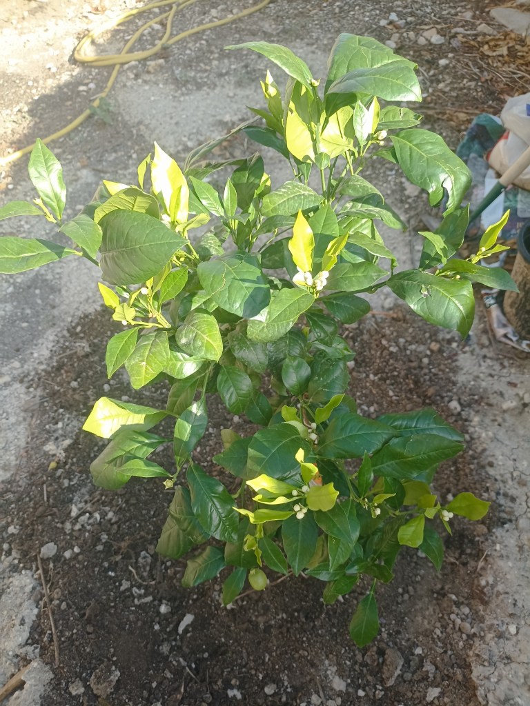 The little blood orange tree which Peter bought me is now safely planted and has lots of blossom buds on it as well as some teeny wee oranges, so it seems to be thriving.