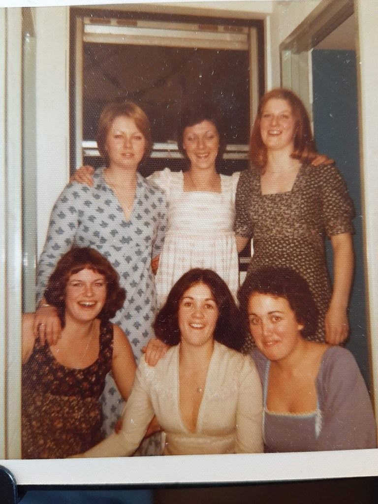 In the meantime, I found an old photo of the six of us, all dressed up for a party in the flat. From the front, left to right is Hilary, Louise and Lin. Back row, left to right is me, Deirdre and Irene.