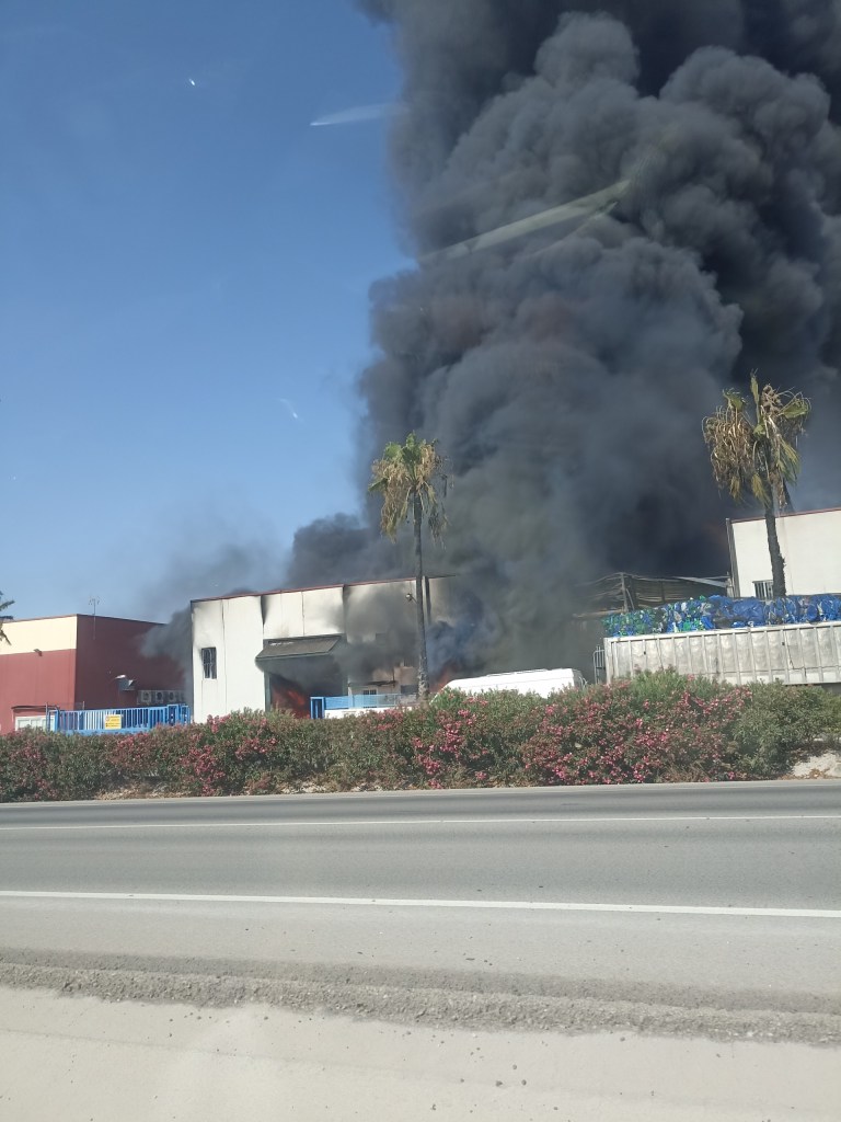 We had a bit of excitement a week or so ago, when I came outside the other morning and, standing on the terrace, I could see thick, black smoke down the valley, from the direction of Fortuna. When we went out about half an hour later, we saw that one of the warehouse units in the industrial estate was on fire, really badly on fire. Traffic was being diverted and a number of fire engines were in attendance. There were also a couple of helicopters using the huge bags to fill with water from local reservoirs and flying over the building to dump water to control the blaze.