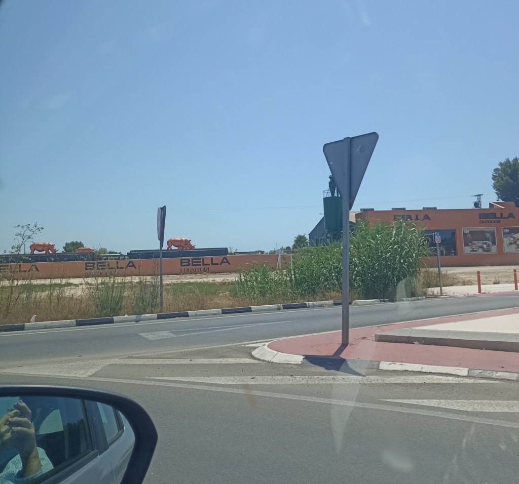 Okay, I have to show you this – it comes under “weird things we have seen”! On the way to one of our favourite restaurants at Guardamar, on the coast, is a huge place which sells furniture, kitchens and garden things. On their flat roof there are about six life-size rhinos. Yes, really, LIFE-SIZE! Now rhinos are fairly huge beasts, so to see these in all their glory, finished in burnished copper, on a roof, at a roundabout, is the most randomly hilarious sight!