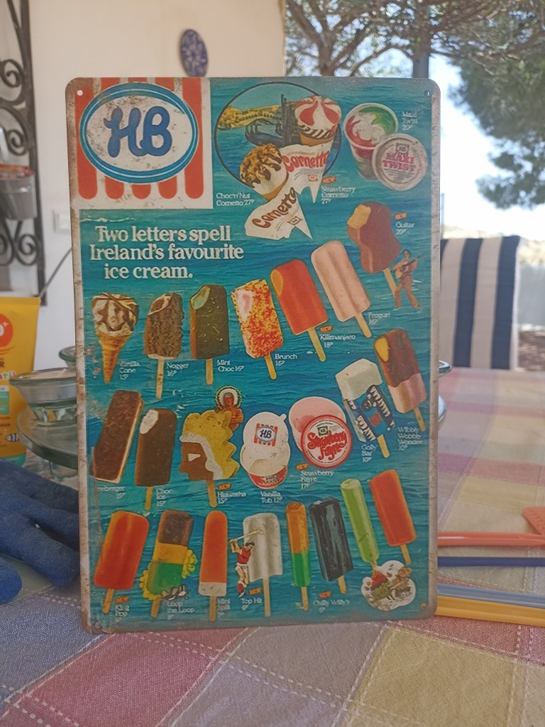 My other purchases this month have been to do with getting the pool courtyard into shape. We really want to treat it like an extra, outside room, so it needs a little bit more than just squillions of different solar lights. I got half a dozen retro-style tinplate pictures of sea scapes and old adverts, to put on the walls. They measure about 20cms by 30cms and are really funky. Remember HB ice lollies and ice creams? I love this one!