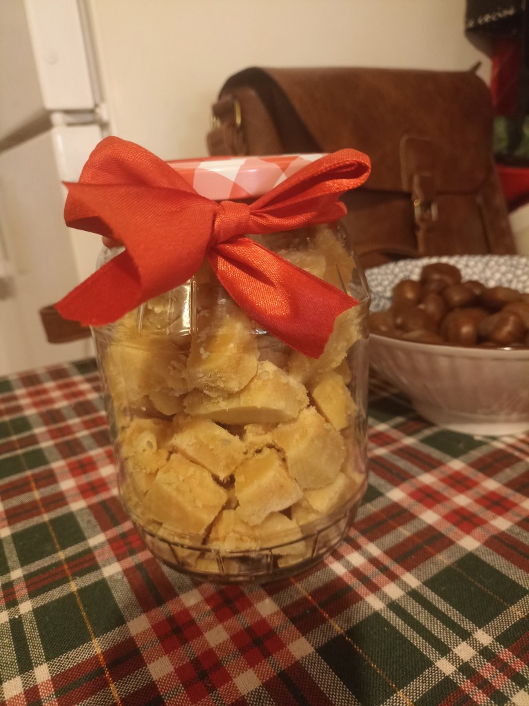 - Pour into a buttered tin and when almost cool cut into small pieces, then pop into jars to give as wee gifts.