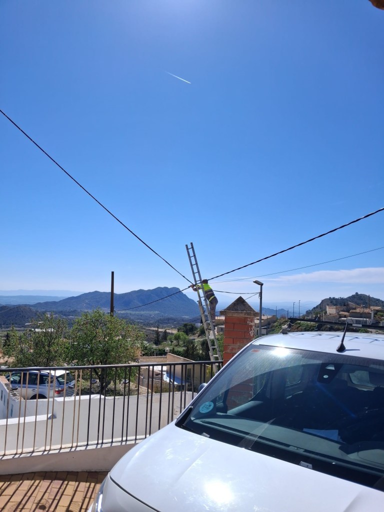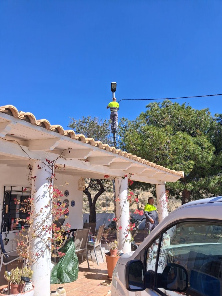 We’ve had a bit of bother with the big lampost outside our house as the wiring was collapsing and looking decidedly dangerous. We tried contacting the company that the town hall told us had responsibility for all the street lighting, but in spite of continually phoning them and waiting in for a few days in a row nobody turned up – unfortunately normal in Spain! Eventually we contacted our electrician, Miguel who also works for the town hall and he advised them it was a danger, and came out himself to do the safety repair. It looked even more dangerous when he had to scale a couple of big poles to secure everything!
