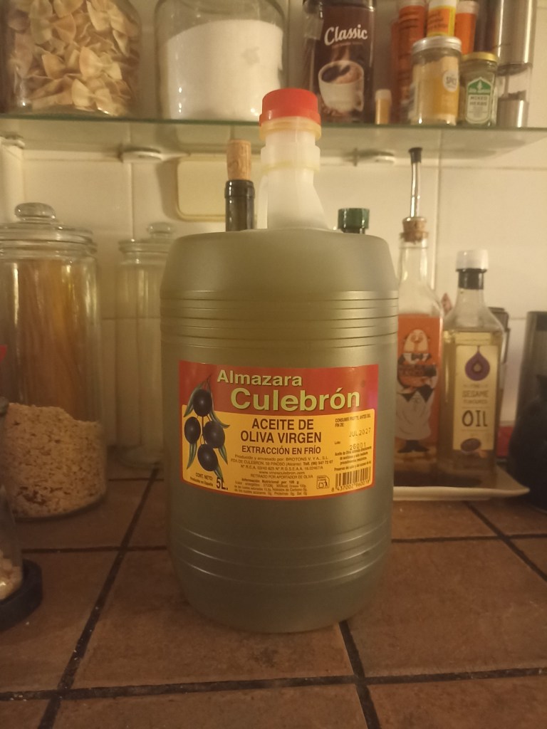 Maria José and Epi insisted on coming up to our house, to help us prune our olive trees – they’d seen Peter having a go and reckoned he needed some help! The first day they came they had actually started the work before we even got out of bed, and they did a fantastic job for us! In addition, and as a gift, they brought us a big 5 litre container of extra virgin olive oil from their own trees.