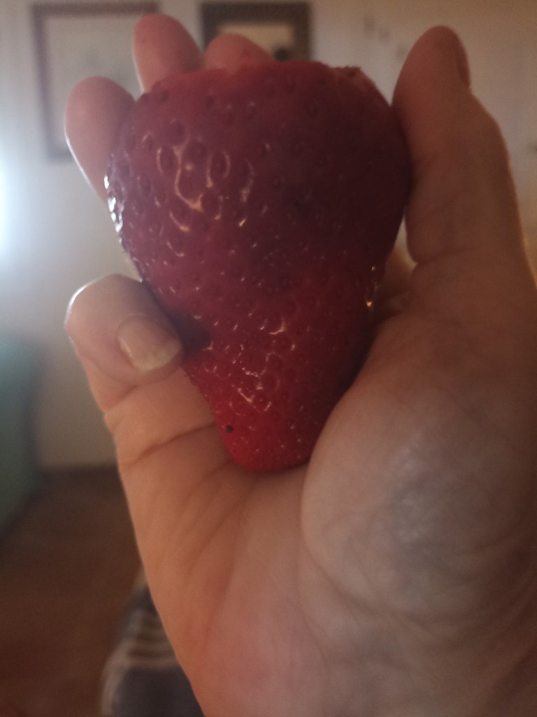 Oh dear! As a balance to all that, we buy fresh produce when in season, and very good it is too, usually from our local market on Saturdays in Fortuna. As a wee reference, how about this for a strawberry?! Not at all unusual, either!