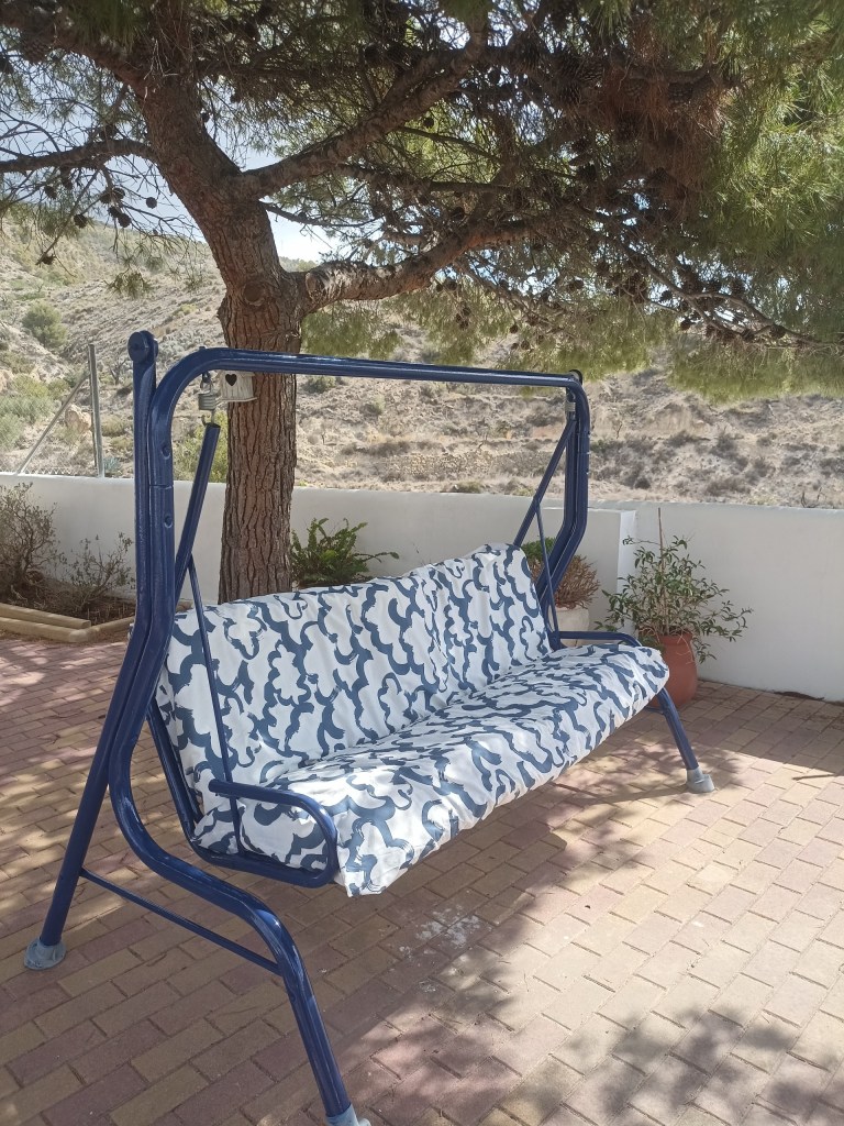 I’ve been hand sewing long cushion covers for the swing seat – Peter has painted the seat frame a lovely sapphire blue. My sewing machine had a nervous breakdown in the heat so it needs a proper service. What would have taken me half an hour at the most to sew by machine has now taken forever with hours spent hand stitching, but when the sewing machine is up and running again I can go over my hand sewn seams properly. It’ll do for now. It’s looking much fresher and brighter now. We need to fix on the canopy frame which I will cover with the same material and then that’s it, job done! I looked for ages for the right material to cover the cushions and make the canopy, but most that I really liked were really expensive. Then I had a brainwave – I bought two single duvet covers from Ikea. One of them, cut lengthways, covered both the seat and back cushions, and with minimal hand-stitching! The other will provide the cover for the canopy. Total cost, €24. So, it’s nearly finished now, thank goodness, another job ticked off the list. It is a really lovely place to sit on the terrace, always a cool breeze and fantastic views over the mountains. There are frequently eagles circling, sure where else would you be?