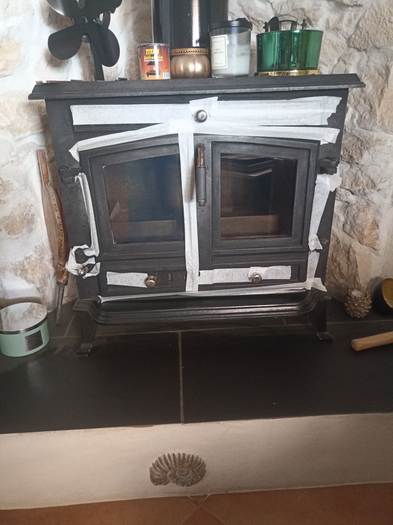 The doors to both the log burners have been taped over to prevent mess in the sitting room and the snug while Peter was up on the roof sweeping down the flues. The soot that resulted was then colleced in a big vacuum cleaner…not one speck of it got loose in either room so the job was well done!